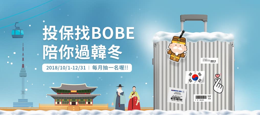 - 於國泰產險BOBE網站,完成投保旅遊險、車險(需同時投保強制險及任意險)、傷害險,就抽華航機票2萬元兌換券(可抵用華航直飛東南/北亞航線任一點之來回機票,不限抵用張數)