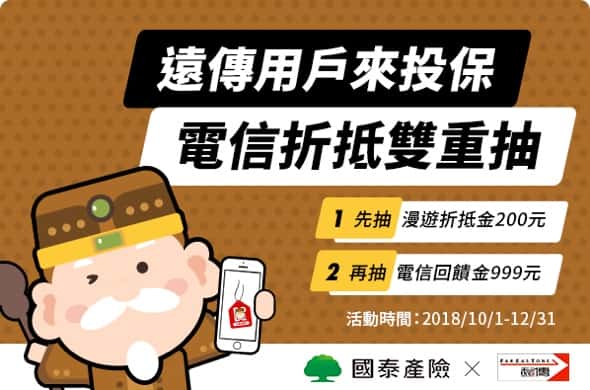 - 強制險到期前2個月即可投保(例:10月份到期者,8/1起即可投保;11月份到期者,9/1起即可投保,依此類推),於2018/10/1-12/31於本網站投保指定險種者(車險需同時投保強制及任意險,方符合抽獎資格),皆可參與上述抽機票活動。