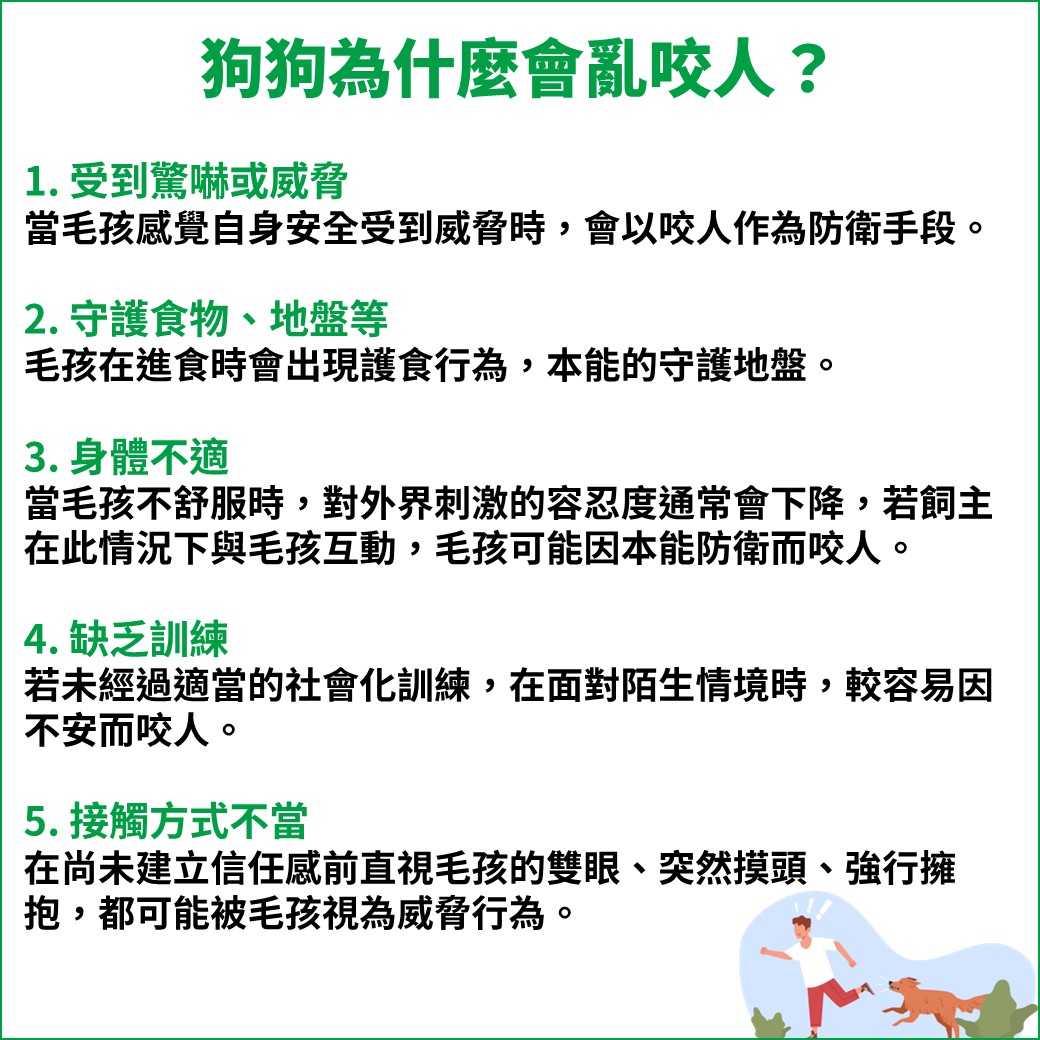 毛孩在進食時會出現護食行為、在熟悉環境中會本能的守護自己的地盤。當外人過度靠近、嘗試觸碰,或被視為威脅時,毛孩可能會以咬人方式來保護自己。這類行為並不代表毛孩天生具有攻擊性,而是本能反射與安全感不足。