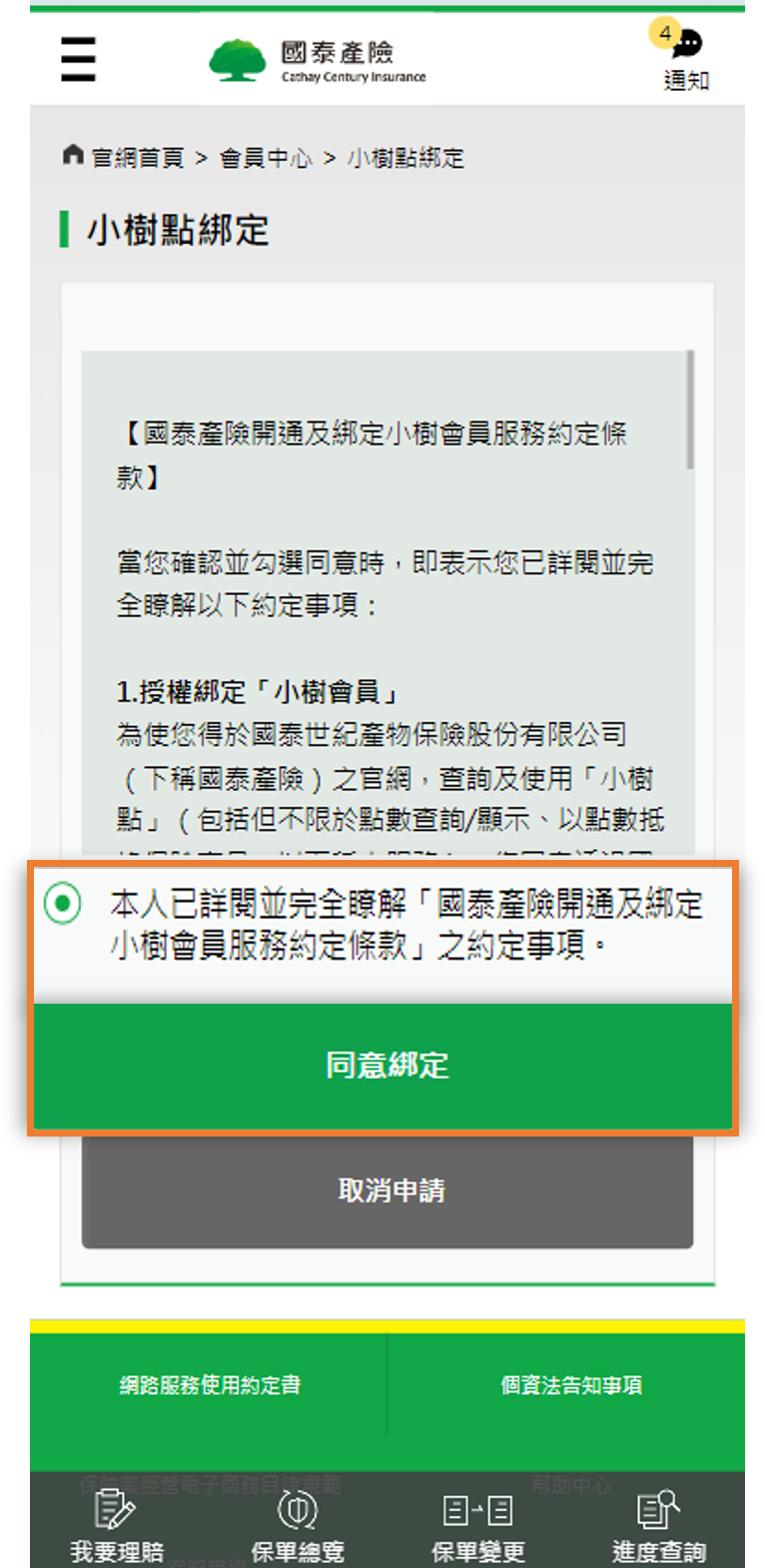 Step3. 閱讀並同意「綁定小樹會員條款」