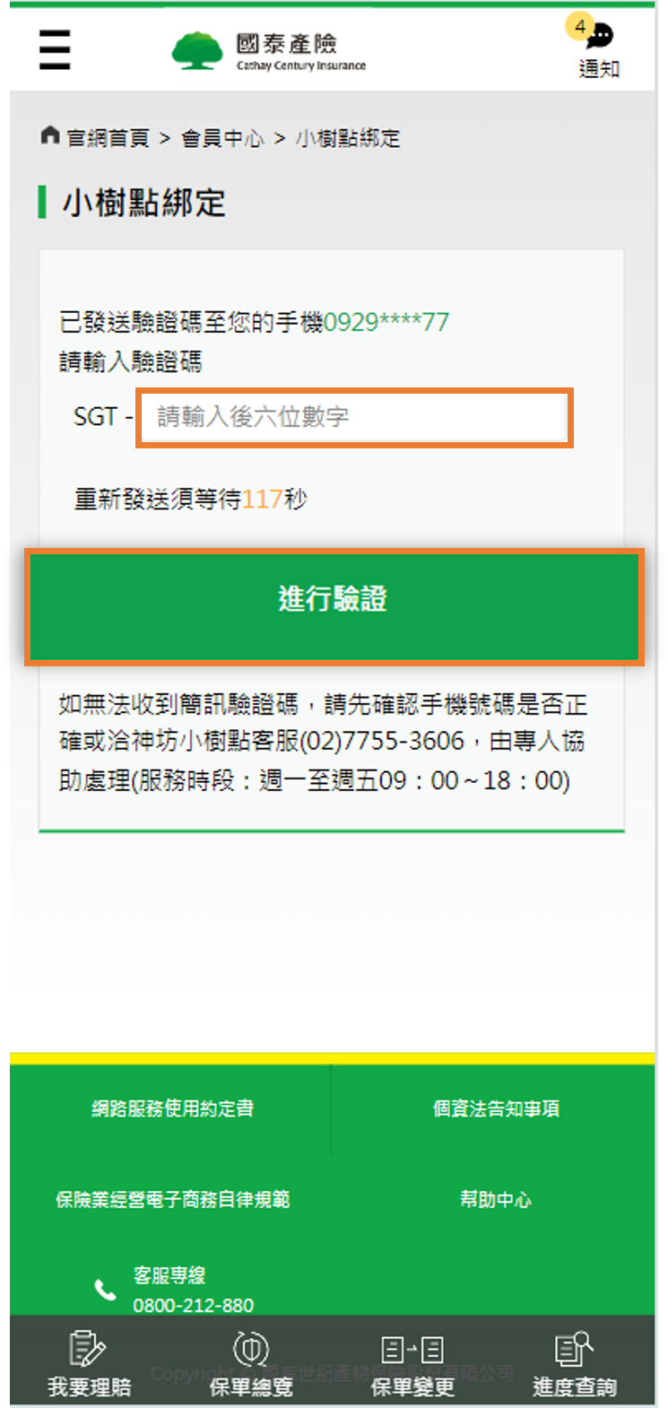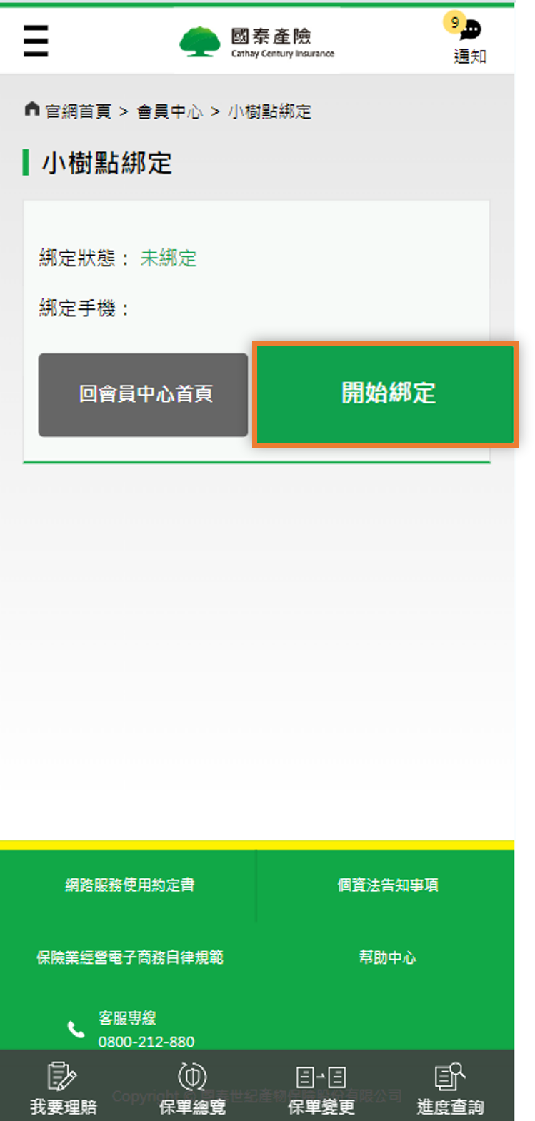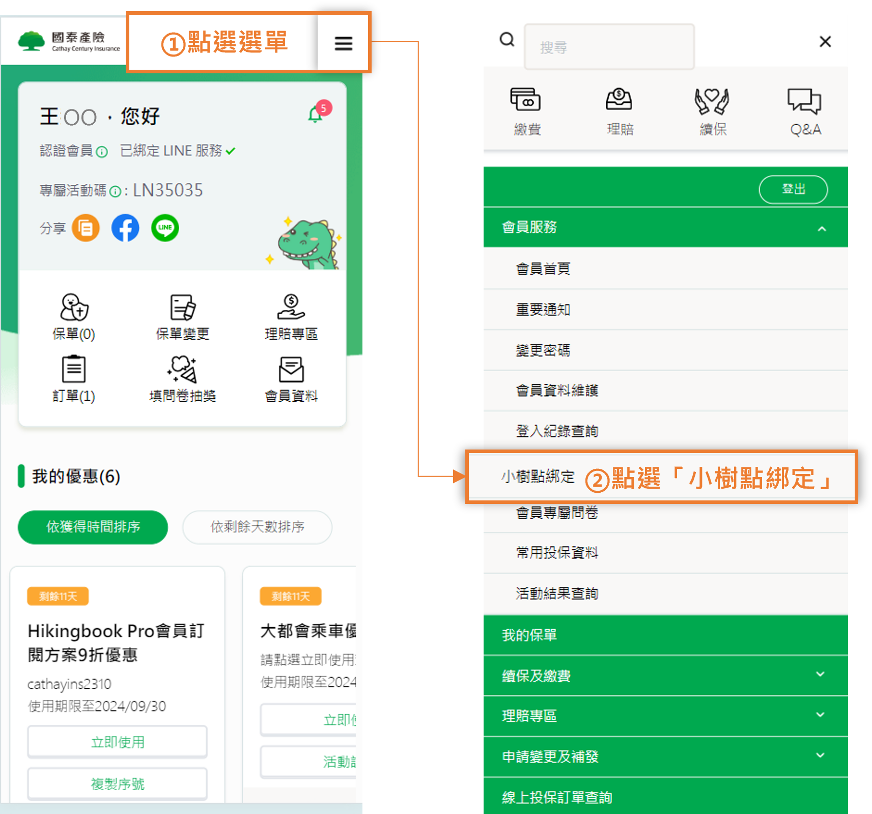 • 小樹點1點等於1元,於國泰產險官網使用小樹點抵換保費,請先至國泰產險-會員中心完成綁定(綁定流程請見下方說明)