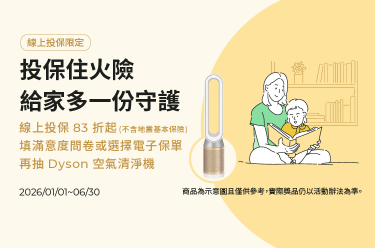 投保住火險 並填寫滿意度問卷或選電子保單即可抽Dyson空氣清淨機一台