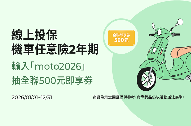 • 線上投保「機車任意險2年期方案」抽全聯500元即享券
