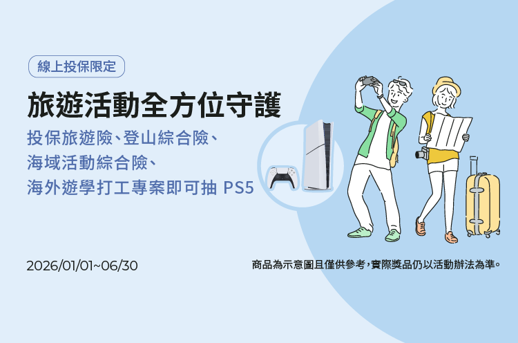 1. 於本網站完成投保海外旅遊險國內旅遊險海域活動綜合險登山綜合險海外遊學打工專案就抽 PS5(PS5 Slim 數位版 輕薄型主機,市價14,580元,共抽1名)。
