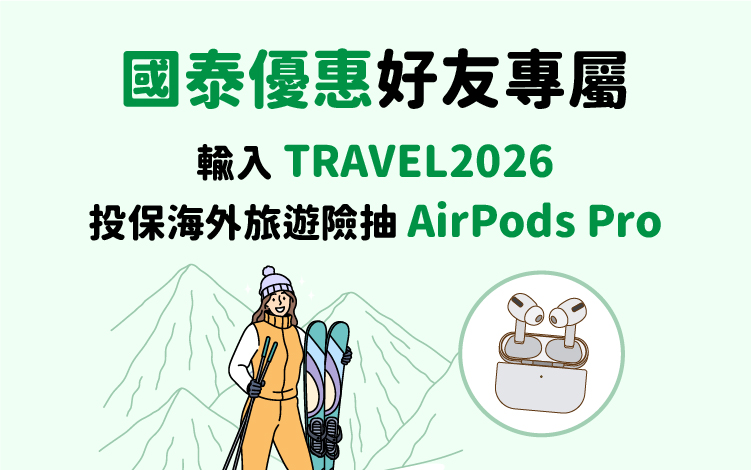• 活動期間於國泰產險海外旅遊險投保網頁輸入活動碼『TRAVEL2026』,並成功投保海外旅遊險,抽AirPods Pro 3(市價7,490元,共抽1名)。